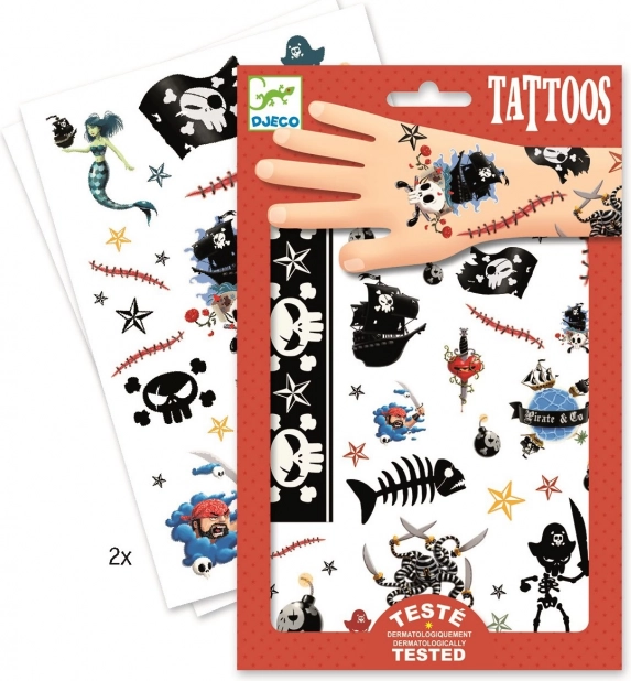 Des tatouages temporaires stylés à motifs pirates de DJECO raviront les petits et grands aventuriers. Dans le paquet, vous trouverez 2 planches pleines d’illustrations originales, parfaites pour les fêtes ou les jeux à thème. Les tatouages sont testés dermatologiquement et conviennent aux enfants dès 3 ans.