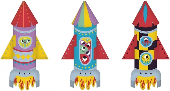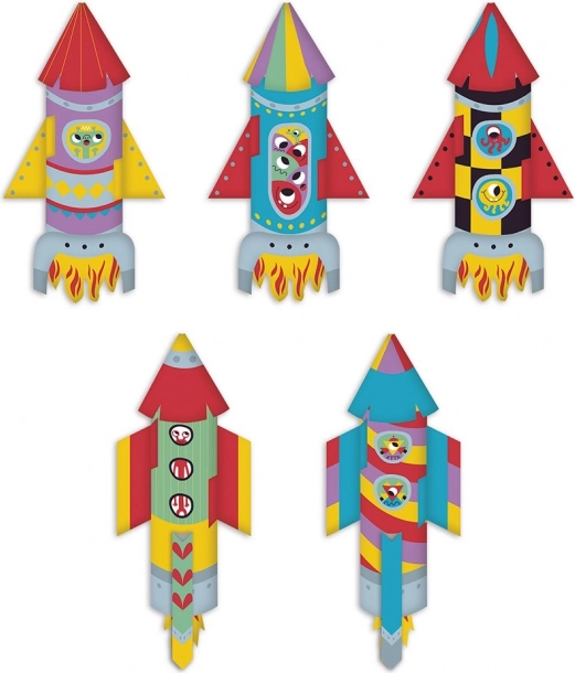 - 5 modèles différents de fusées avec des illustrations colorées.