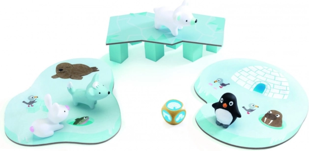 Le set comprend 4 figurines d’animaux finement détaillées (pingouin, ours polaire, renard blanc, lapin blanc), 3 plateaux de jeu sur le thème de la glace, des éléments spéciaux comme des trous de pêche, un pont, un plateau igloo et 6 piliers. Grâce à des règles simples et à une réalisation attrayante, le jeu est idéal comme première expérience coopérative pour les enfants d’âge préscolaire.