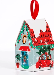 Emballage pratique dans une boîte en forme de petite maison enneigée