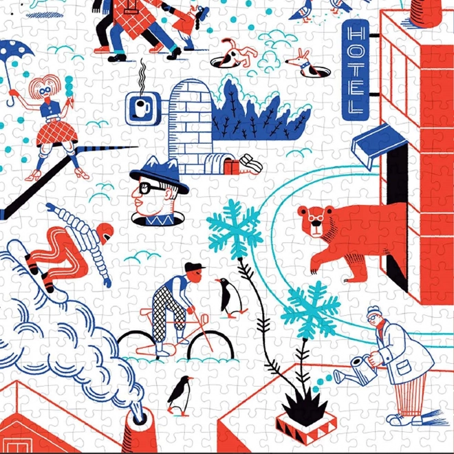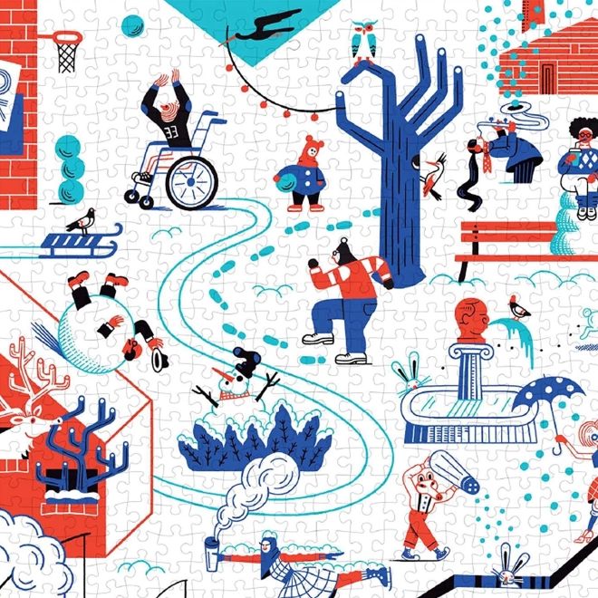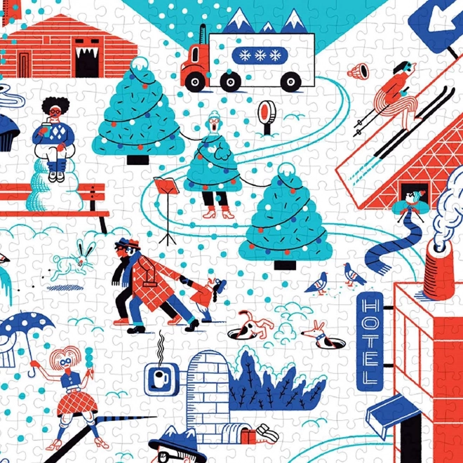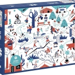 Le puzzle offre un regard joyeux sur un monde hivernal rempli d’activités comme le ski et le patinage.