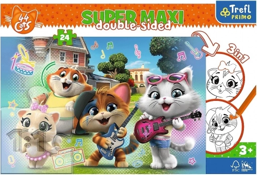 Ce puzzle grand format Super Maxi offre aux enfants trois activités en un seul produit. Le recto propose une image colorée avec les héros de 44 CATS, tandis que le verso cache un coloriage et un jeu logique avec coloriage. Grâce à ses 24 grandes pièces, le puzzle se monte facilement même par de petites mains et développe la motricité fine, la concentration et l’imagination.