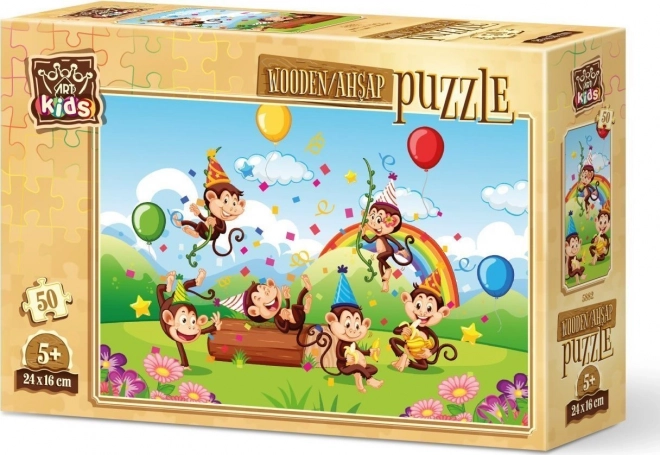 Puzzle en bois Fête des singes avec 50 pièces en contreplaqué africain flexible offre un assemblage ludique pour enfants et adultes. Format compact d’environ 24 × 16 cm, idéal en voyage comme à la maison.