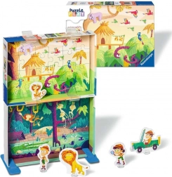 Le coffret Ravensburger Puzzle & Play : Aventure dans la jungle offre deux fois plus de plaisir : d’abord l’assemblage de deux puzzles colorés (24 pièces chacun), puis le jeu de théâtre avec les figurines incluses. En combinant les deux parties de la boîte, vous créez facilement une scène stable dans laquelle les puzzles s’insèrent comme décor de fond.