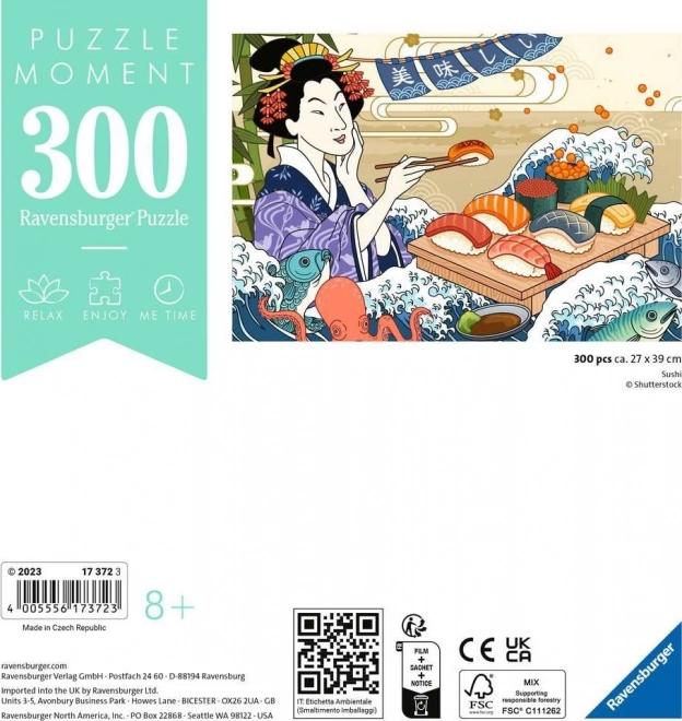 Découvrez le plaisir d’assembler avec la collection RAVENSBURGER Puzzle Moment. Ce motif sushi est un excellent choix pour tous ceux qui recherchent un instant de calme et de concentration. Avec 300 pièces, le puzzle se termine en une à deux soirées et offre des couleurs éclatantes et une impression détaillée.