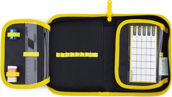 Trousse à un étage permettant de fixer différents accessoires scolaires, équipée d'un film transparent pour le planificateur d'horaires.