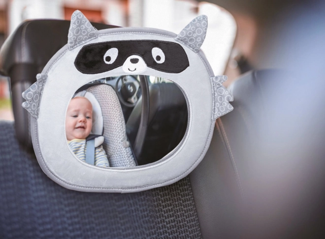 Adorable miroir de voiture en peluche avec motif de raton laveur de FreeON, facilitant la surveillance du bébé pendant le trajet. Offre une installation facile grâce aux boucles et au velcro, et favorise la concentration de l’enfant grâce à son design attrayant.
