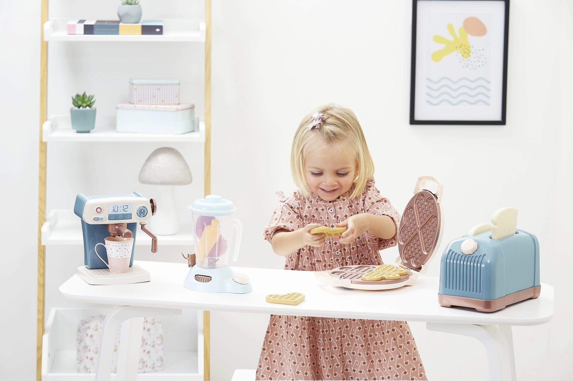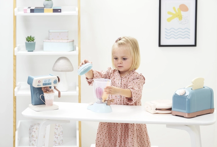 Ce set stylé pour petits cuisiniers apporte tout ce dont les enfants ont besoin pour imiter les adultes en cuisine. Le grille-pain avec « tranches », la cafetière réaliste, le joli gaufrier et le mixeur transparent invitent à « cuisiner » en s’amusant, à servir et à partager le repas. Favorise la concentration, la pensée logique et la coordination œil‑main.