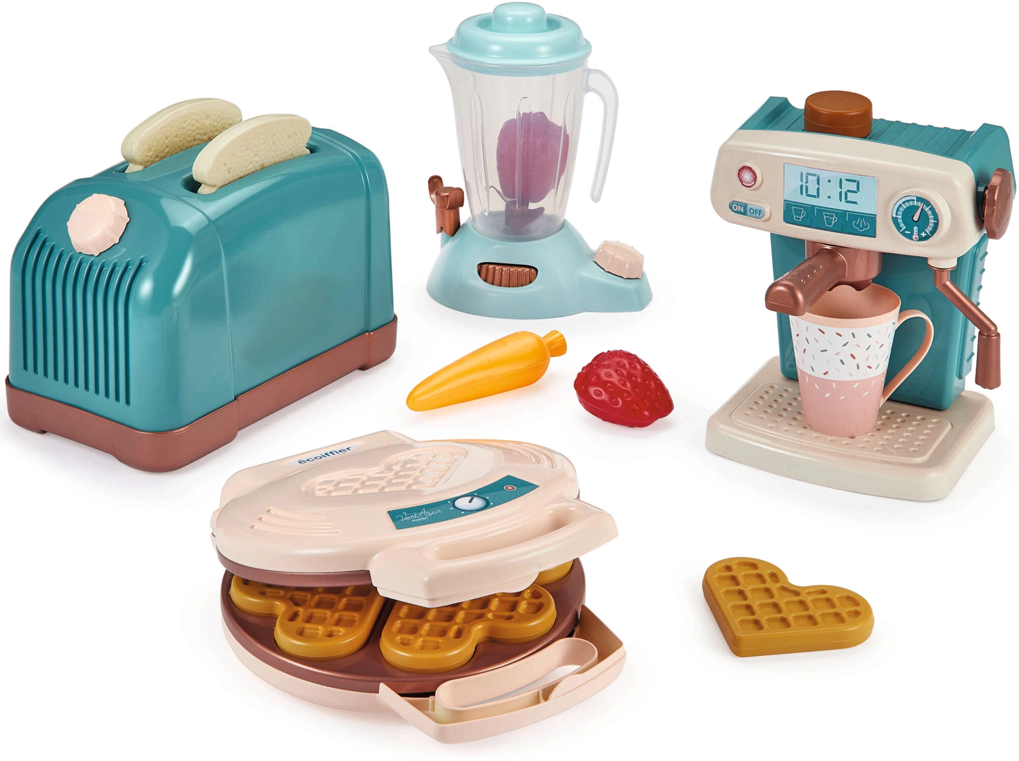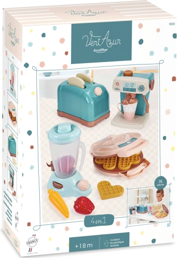 Découvrez le monde créatif de la cuisine avec le set de cuisine pour enfants ECOIFFIER Vert Azur – grille-pain, cafetière, gaufrier et mixeur complétés par 15 pièces d’accessoires. Le set stimule l’imagination, la motricité fine et le jeu de rôle, possède des éléments mobiles et est fabriqué en plastique de qualité dans des tons modernes bleu‑brun.