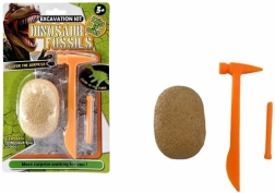 bloc avec « fossile », pièces du squelette de dinosaure, outils (généralement : burin, petit pinceau)