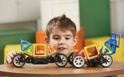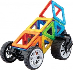 L’un des châssis spéciaux est doté de roues massives pouvant pivoter indépendamment jusqu’à 90°, ce qui permet de modéliser des véhicules à une ou deux voies. Le second châssis est un essieu classique avec 2 roues reliées, offrant la possibilité de régler 3 hauteurs différentes pour la plaque de liaison, idéal pour des carrosseries audacieuses de quads et de buggys. En combinaison avec n’importe quelles autres pièces Magformers, la variété et la taille des véhicules augmentent considérablement. La plupart des centaines de voitures et motos construites avec cet ensemble sont étonnamment résistantes et peuvent donc être utilisées sans crainte comme jouets fonctionnels. Convient aux enfants à partir de 3 ans.