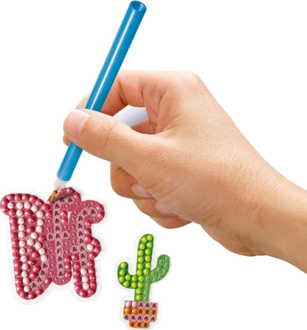 Procédure : choisissez un autocollant à surface adhésive, versez les diamants dans le plateau, prenez de la cire sur la pointe du stylo et appliquez les strass selon la légende ou à votre guise.