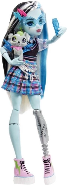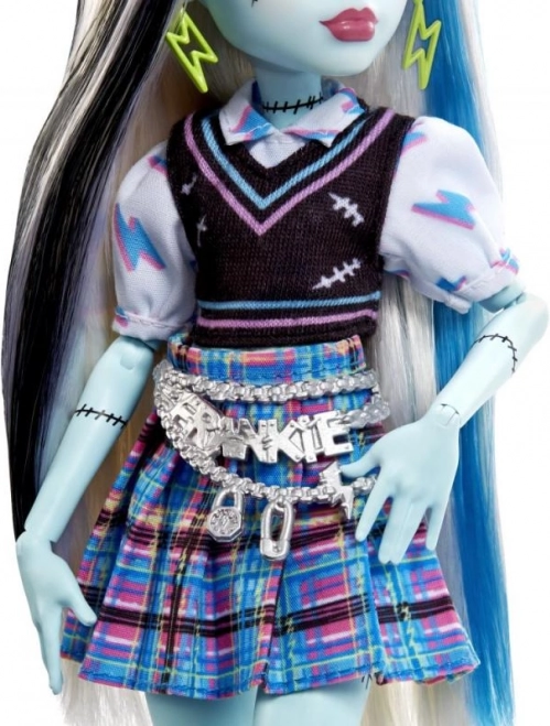 La poupée Frankie Stein est prête à briller dans les couloirs de l'école avec un look unique. Sa tenue comprend une jupe à carreaux stylée, une blouse à motif d'éclairs et un camisole, complétés par des chaussures plateformes et d'autres accessoires comme des lunettes et des boucles d'oreilles en forme d'éclair.