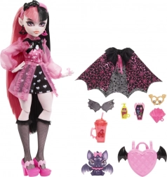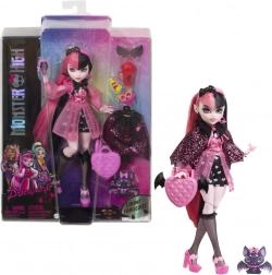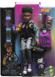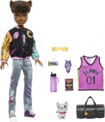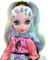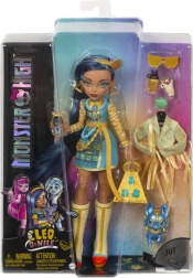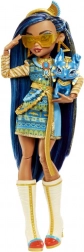 La poupée Cleo De Nile de la collection Monster High brille dans une tenue iconique inspirée de l’Égypte antique : une robe bleu‑or avec des manches rappelant des bandages, complétée par une ceinture chaîne et des bottes hautes sous le genou. Le look est souligné par des bijoux dorés et des lunettes de soleil stylées.