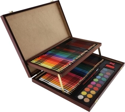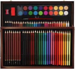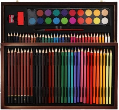 Découvrez un ensemble artistique complet, idéal pour les artistes petits et grands. Ce coffret pratique en bois élégant offre tout le nécessaire pour peindre et dessiner, y compris des crayons de couleur, un taille-crayon, une gomme et des aquarelles, soit un total de 91 articles.