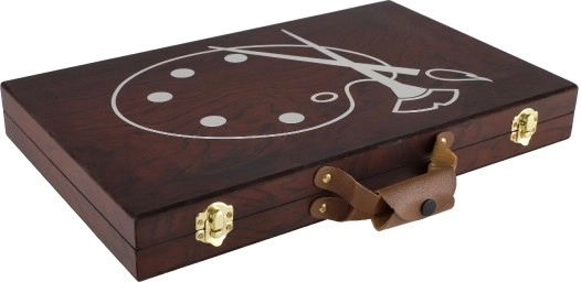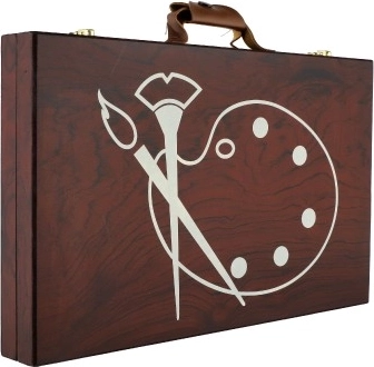 La mallette artistique en bois est conçue pour être facilement transportable grâce à une poignée pratique et à un matériau résistant.