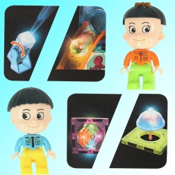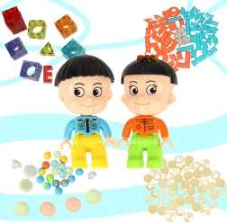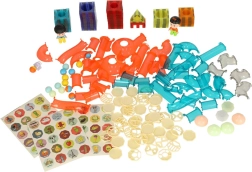 - Billes x12 ; Blocs lumineux x14 ; Carrés magnétiques x60 ; Triangles magnétiques x4 ; Pièces magnétiques en forme de « E » x4 ; Autres pièces de formes diverses x106 ; Personnages x2 ; Autocollants