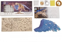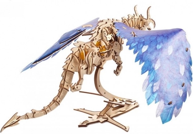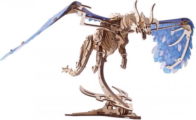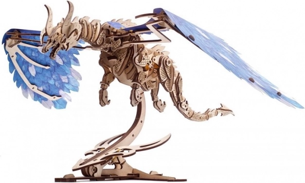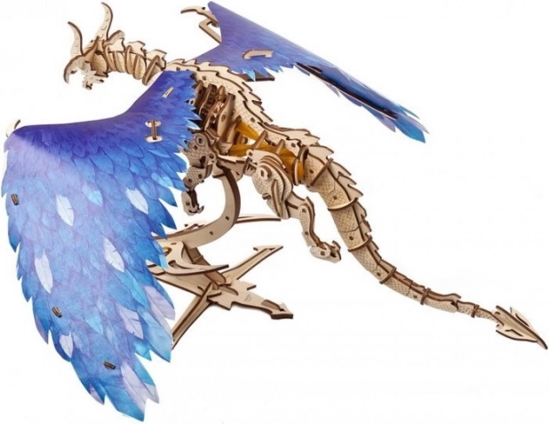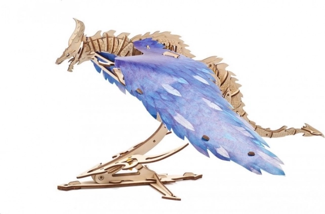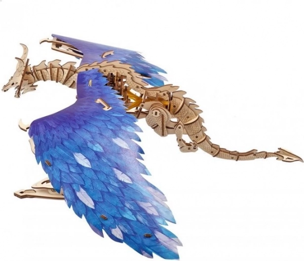 Les pièces en contreplaqué découpées au laser s’emboîtent avec précision et forment un modèle de dragon réaliste aux ailes bleues saisissantes, prêt à briller sur son socle comme en action.