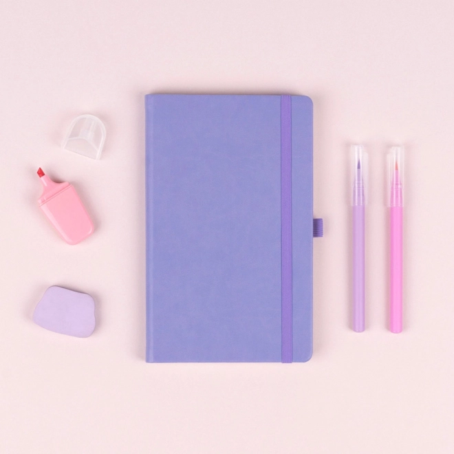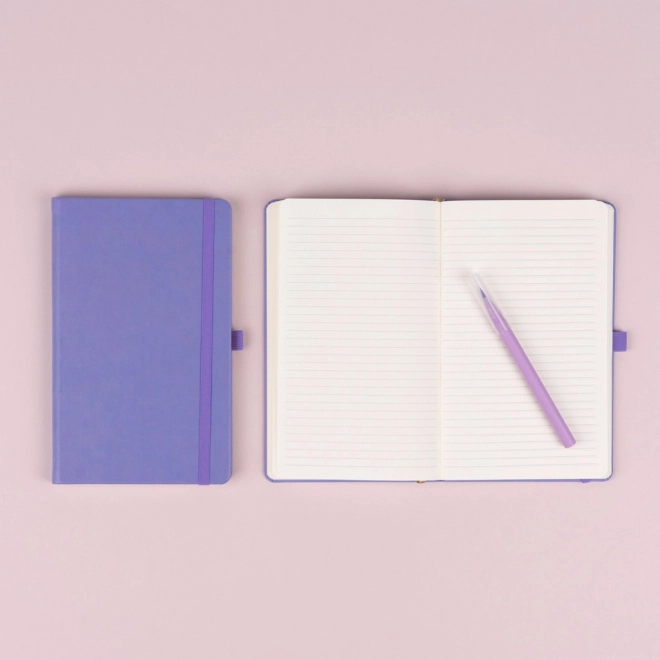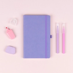 Carnet ligné stylé dans une teinte lila tendance, idéal pour les notes quotidiennes et la planification. Il offre une reliure rigide de type livre, un élastique de fermeture, un porte-stylo et un marque-page en tissu. Papier jaune de qualité avec un lignage de 6 mm pour une écriture agréable et un rendu soigné. Excellent choix aussi pour le branding avec logo embossé.