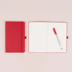 Carnet élégant à pois de couleur rouge, reliure rigide et accessoires pratiques, idéal pour la planification, le croquis et le bullet journal. Il offre un papier jaune à points de 5 mm, un porte-stylo, un élastique et un marque-page en tissu. La surface à la texture plus rugueuse permet le gaufrage d’un logo, ce qui en fait également un excellent cadeau d’entreprise.