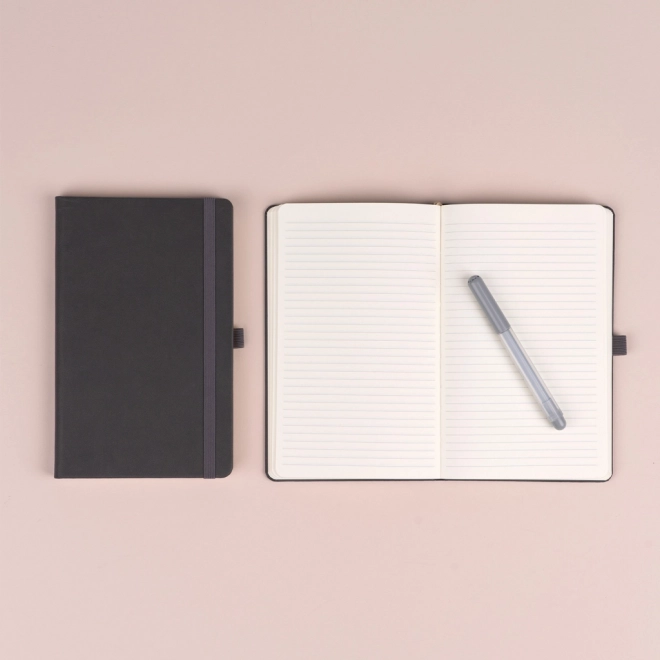 Carnet ligné élégant de couleur grise au format 13 × 21 cm avec reliure rigide, idéal pour le travail comme pour les études. Il offre des couvertures rigides résistantes, un élastique de fermeture sécurisé, un porte-stylo, un ruban marque-page et des lignes de 6 mm sur un papier jaune de qualité. Parfait également pour le branding d’entreprise grâce à la possibilité de marquage à chaud du logo.