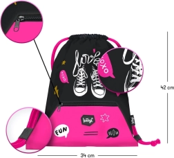 La combinaison de couleurs noir et rose avec des motifs ludiques comme des baskets et des inscriptions telles que « love » et « xoxo » fait de ce sac un accessoire de mode.