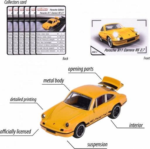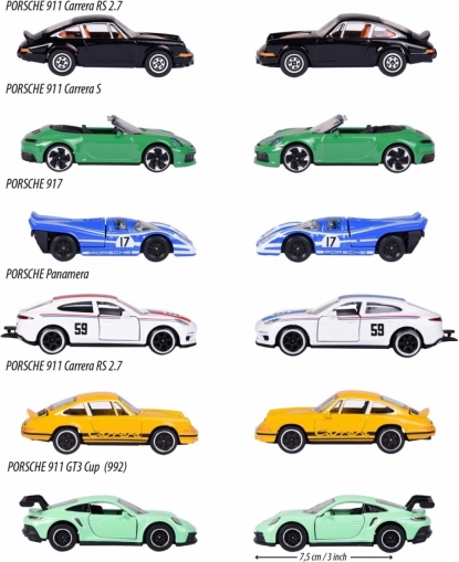 L’édition comprend un assortiment de six véhicules légendaires : Porsche 911 Carrera S (vert), Porsche 917 (bleu), Porsche 911 Carrera RS 2.7 (noir et jaune), Porsche 911 GT3 Cup (992) (turquoise) et Porsche Panamera (blanc). Le contenu de l’emballage est aléatoire – il n’est pas possible de choisir un modèle précis. Chaque voiture mesure environ 7,5 cm et est complétée par une carte de collection avec des informations telles que la vitesse ou le nombre de cylindres.