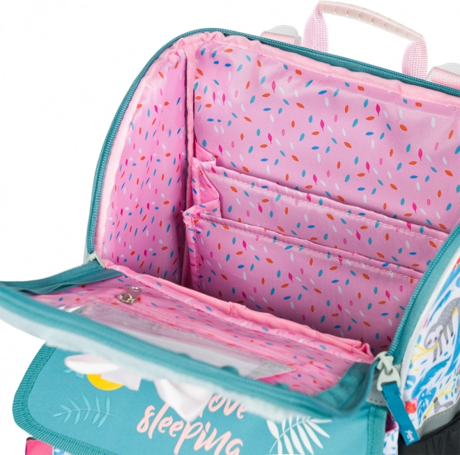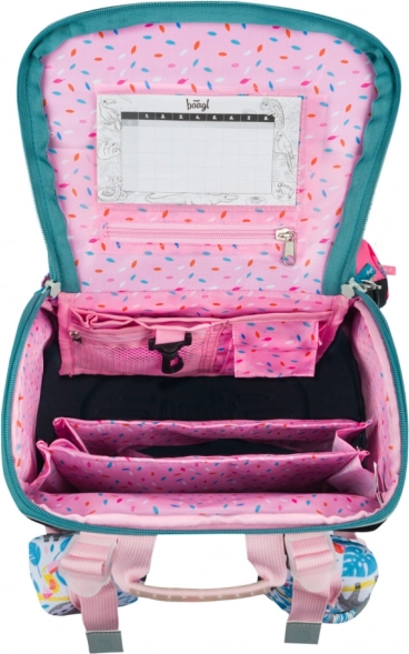 • À l’intérieur, une poche transparente avec emploi du temps et un organiseur interne permettant une répartition uniforme du poids, complétés par un élastique de fixation.