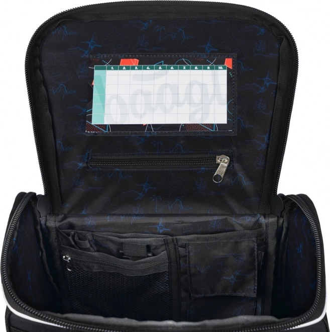 • À l’intérieur, une poche transparente avec emploi du temps et un organiseur interne permettant une répartition uniforme du poids, complétés par un élastique de maintien.
