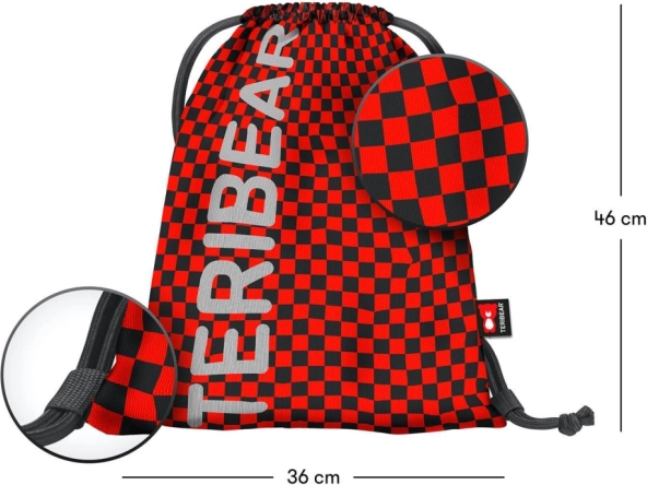 Le serrage à l’aide de cordons ferme le sac en toute sécurité et permet en même temps un port confortable sur le dos. Le design damier rouge-noir avec l’inscription TERIBEAR apporte une touche marquée à votre tenue.