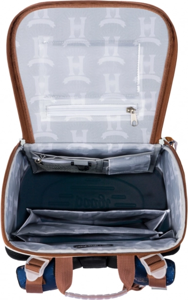 Le cartable est doté d'un système d'ouverture basculante moderne, qui facilite l'accès aux fournitures scolaires directement depuis le bureau. À l'intérieur, vous trouverez une poche transparente avec emploi du temps et un organiseur pour une répartition uniforme du poids, complété par un élastique pour leur fixation.