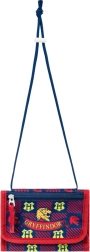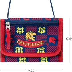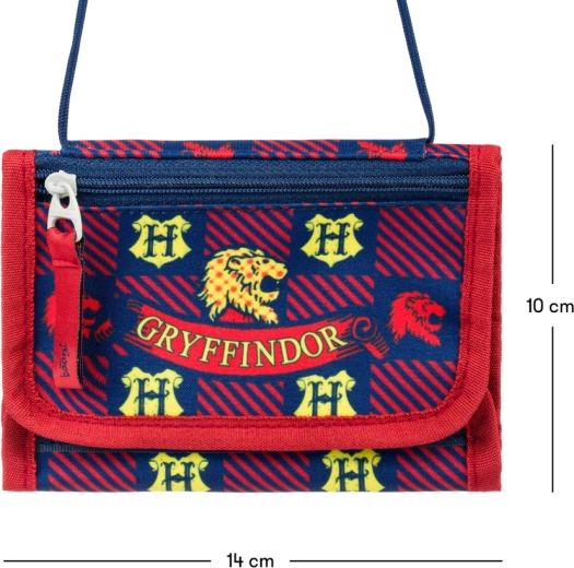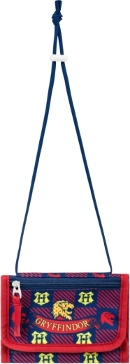 Trousse à deux rabats, sac pour chaussures avec poche frontale zippée, chemises protège-cahiers et porte-monnaie à porter au cou – le tout dans les couleurs et avec l’emblème de Gryffondor.