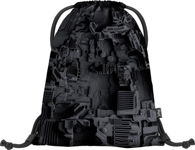 Le sac se distingue par un design géométrique 3D en noir et gris, lui conférant un aspect moderne et technologique.