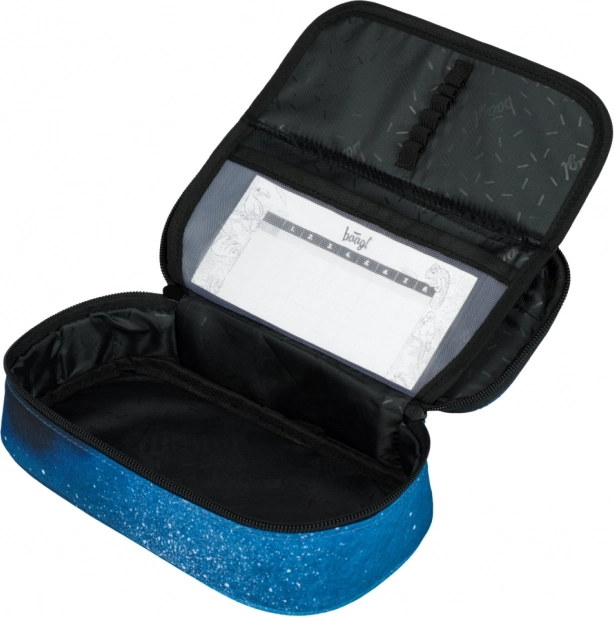 Trousse solide avec une cloison intérieure rabattable contenant un emploi du temps et une poche zippée.