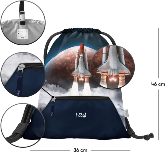 Le sac BAAGL Space Shuttle complète parfaitement l'équipement scolaire grâce au mousqueton qui permet de l'attacher au cartable. Il est fabriqué dans un matériau robuste qui garantit une longue durée de vie et un entretien facile. Dans la partie inférieure du sac se trouve une petite poche zippée pratique pour ranger de petits objets.