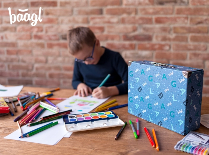 Pratique et stylée, la mallette scolaire BAAGL de couleur bleue est idéale pour ranger clairement les fournitures scolaires et les petits objets. Grâce à sa structure rigide laminée, à ses coins renforcés métalliques et à sa poignée métallique avec boucle, elle offre résistance et transport sécurisé. Le design pliable avec boutons-pression permet de la plier ou déplier rapidement à tout moment.