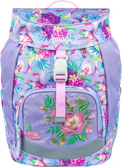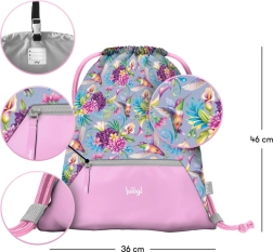 - Design : motif ludique de colibris et de fleurs, sac à dos, trousse et sac assortis.