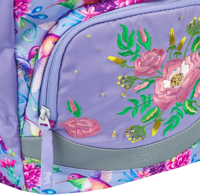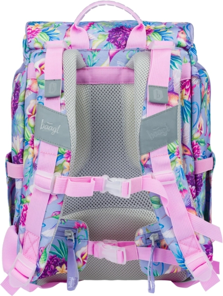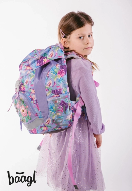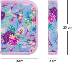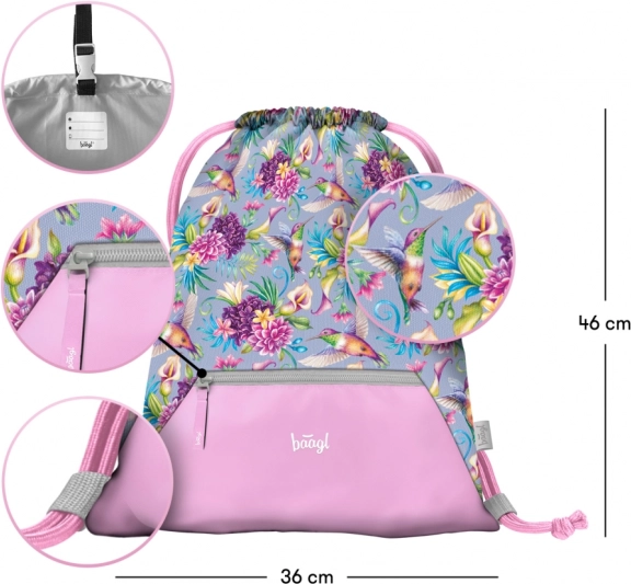 Ensemble scolaire BAAGL léger et confortable pour le premier degré du primaire, combinant un sac à dos Airy ultraléger, une trousse pratique à deux rabats et un sac résistant pour chaussures de rechange ou sport. Le dos ergonomique avec système Airflow Ergo, les éléments réfléchissants, la fermeture magnétique et le matériau déperlant assurent sécurité, confort et longévité, le tout dans un joli motif de colibris et de fleurs.