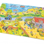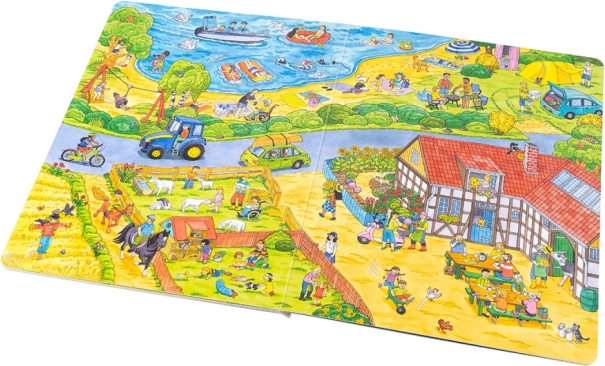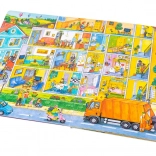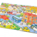 Ce livre grand format est idéal pour lire et raconter ensemble. Les enfants découvrent ce qui se passe en ville du matin au soir – du travail des éboueurs et des courses, à la maternelle, au chantier, aux pompiers et à la police, jusqu’aux jeux de l’après-midi au parc et aux excursions au lac ou à la ferme. Chaque page regorge de sujets de discussion et de détails à chercher.