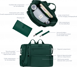 Le sac peut se porter sur le dos, se fixer à une poussette à l’aide de bretelles/attaches universelles amovibles, ou s’utiliser comme accessoire autonome. La poche à langer fait également office de compartiment pour tablette ou ordinateur portable, tandis que les poches latérales et intérieures gardent tout à portée de main. Grâce aux boucles, il est possible de réduire la taille pour que le sac entre sous le siège de l’avion.