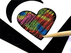 Sous la couche noire se cachent des couleurs vives qui, après grattage, créent des images et des décorations spectaculaires.