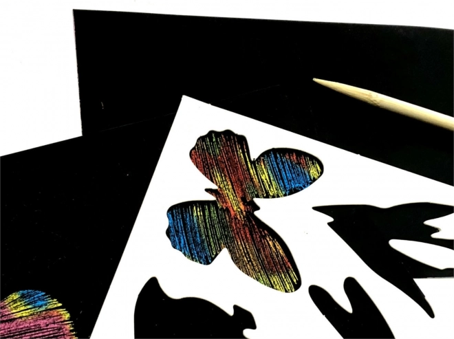 Ce kit créatif est parfait pour les artistes en herbe comme pour les grands. La couche noire du papier dissimule un fond arc-en-ciel multicolore qui se révèle en grattant avec le stylet en bois inclus. Grâce aux pochoirs, vous réalisez facilement des formes nettes et des décorations – ou laissez libre cours à votre imagination.
