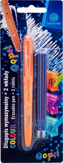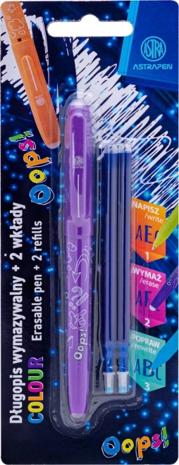 Le stylo effaçable pratique ASTRA OOPS! avec une finesse de trait de 0,6 mm est idéal pour l’école comme pour le bureau. Il contient une encre spéciale qui peut être facilement effacée aux deux extrémités du stylo, et grâce à sa prise en main ergonomique, il offre une écriture confortable sans fatigue. L’emballage comprend 2 recharges de rechange pour une plus longue durée d’utilisation.