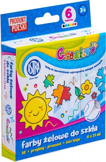 Peintures gel ASTRA CREATIVO pour créer des vitraux et des décorations sur des surfaces lisses. Après séchage, elles deviennent une autocollante en gel transférable qui adhère sans colle sur le verre, la porcelaine, les miroirs, les carreaux en céramique et les plastiques. Coffret pratique 6×15 ml pour des créations créatives.