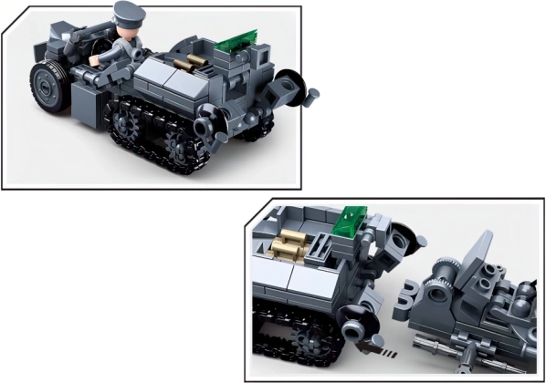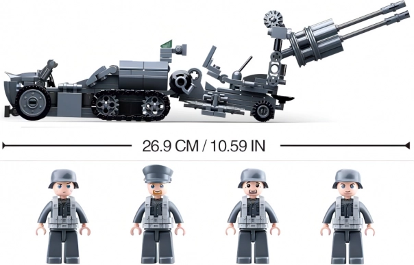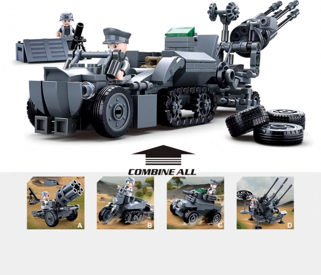 Ce kit de construction apporte des éléments complets pour créer des scénarios militaires avec une technologie antiaérienne allemande. Les pièces principales incluent un lance-roquettes, un canon antiaérien, un véhicule blindé et une moto spéciale à chenilles. En combinant les éléments, vous pouvez créer un grand modèle d’unité d’assaut mobile.