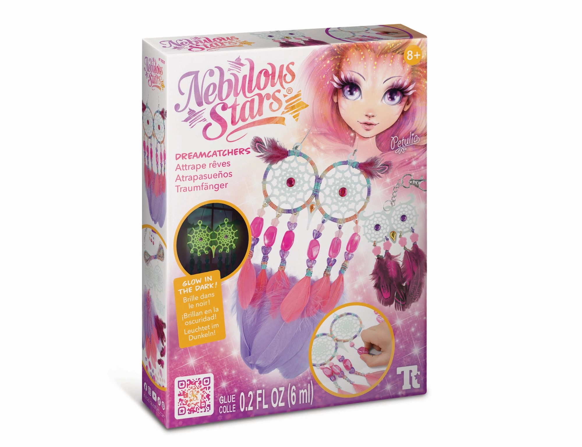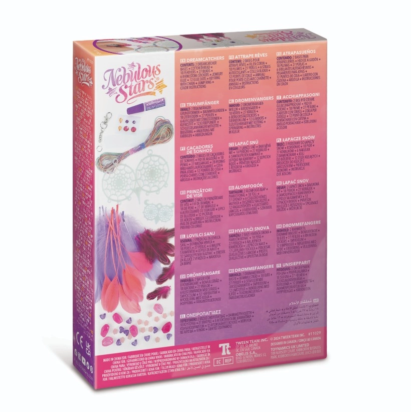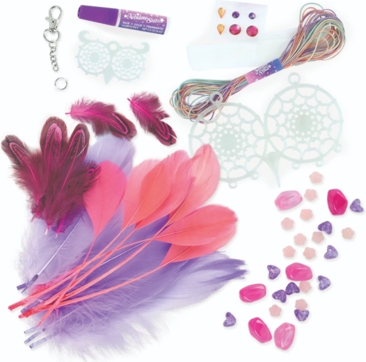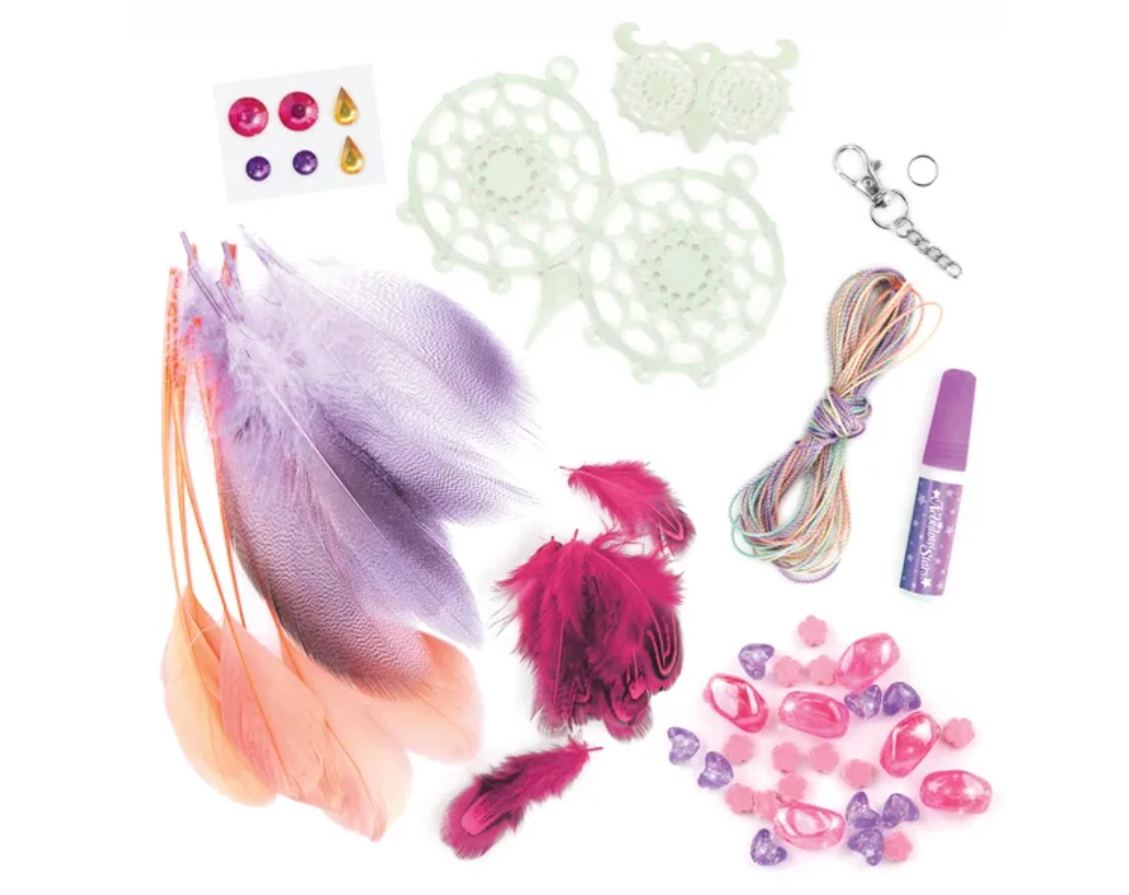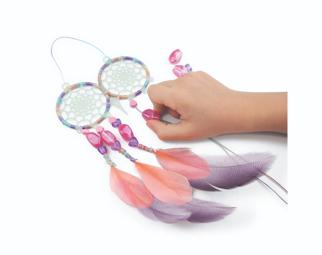 Le coffret contient 2 bases d’attrape-rêves phosphorescentes, des fils de coton, 28 plumes, 28 perles stylées, 6 stickers strass et de la colle pour bijoux.