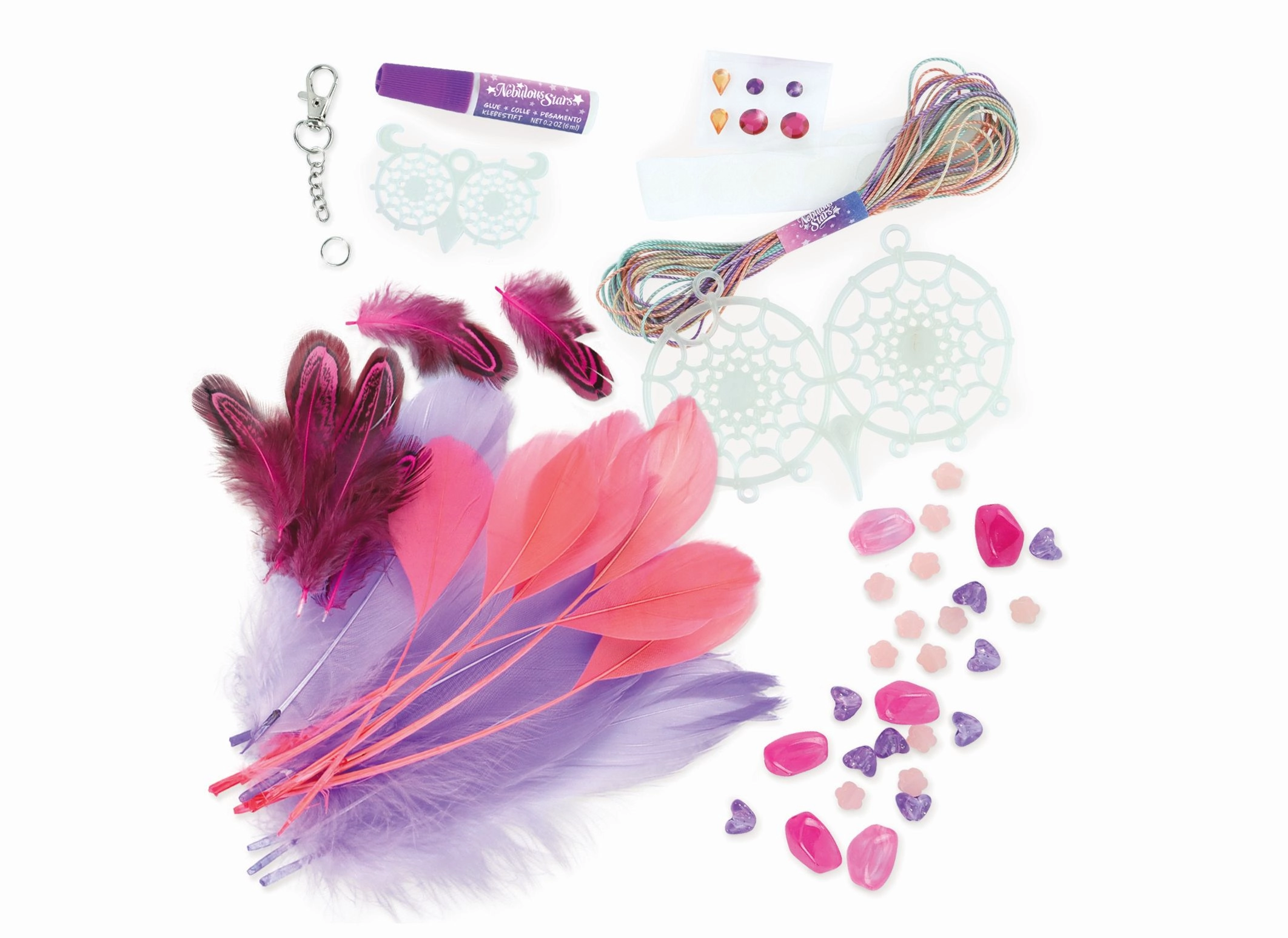 - 2 bases d’attrape-rêves, 2 couleurs de fil de coton, 28 plumes, 28 perles, 6 stickers strass, colle pour bijoux