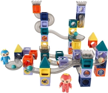 Des blocs, rampes et accessoires variés permettent d’assembler sans cesse de nouveaux parcours à billes. Les enfants découvrent ainsi les principes de la gravité et de la vitesse de manière ludique.
