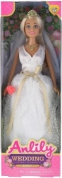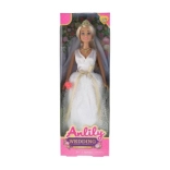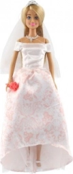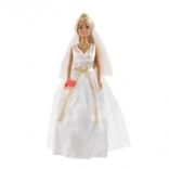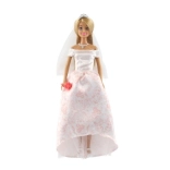 La poupée est vêtue d'une magnifique robe de mariée avec un motif de dentelle et un voile, ajoutant à son élégance.