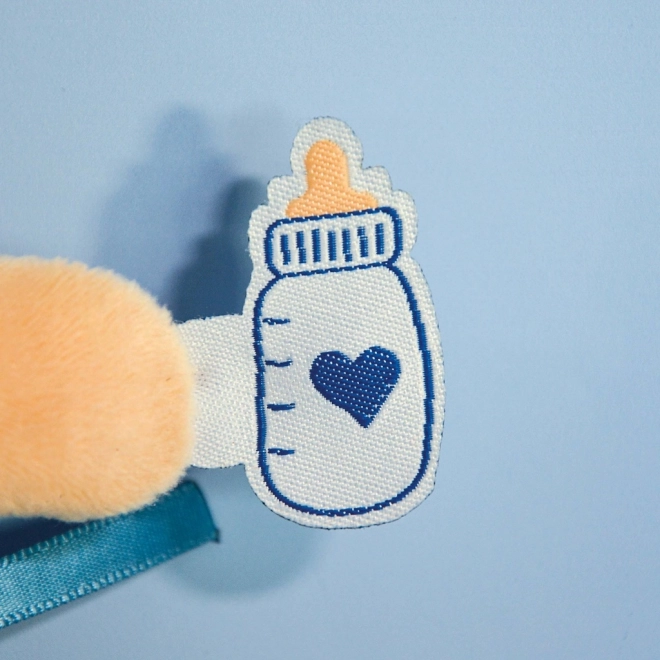 Mini poupée douce Doudou Jolijou 18 cm en bleu. Matières délicates, détails brodés, biberon en main, lavage à 30 °C, adaptée dès la naissance, conforme CE.